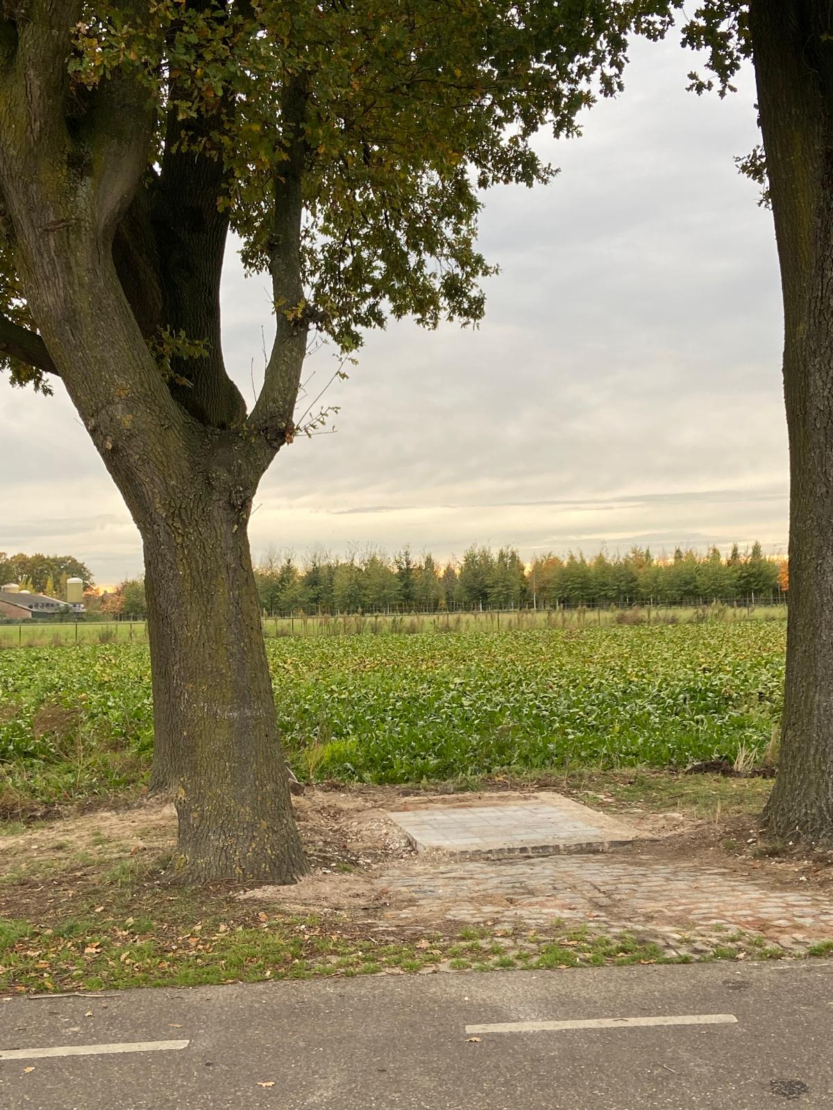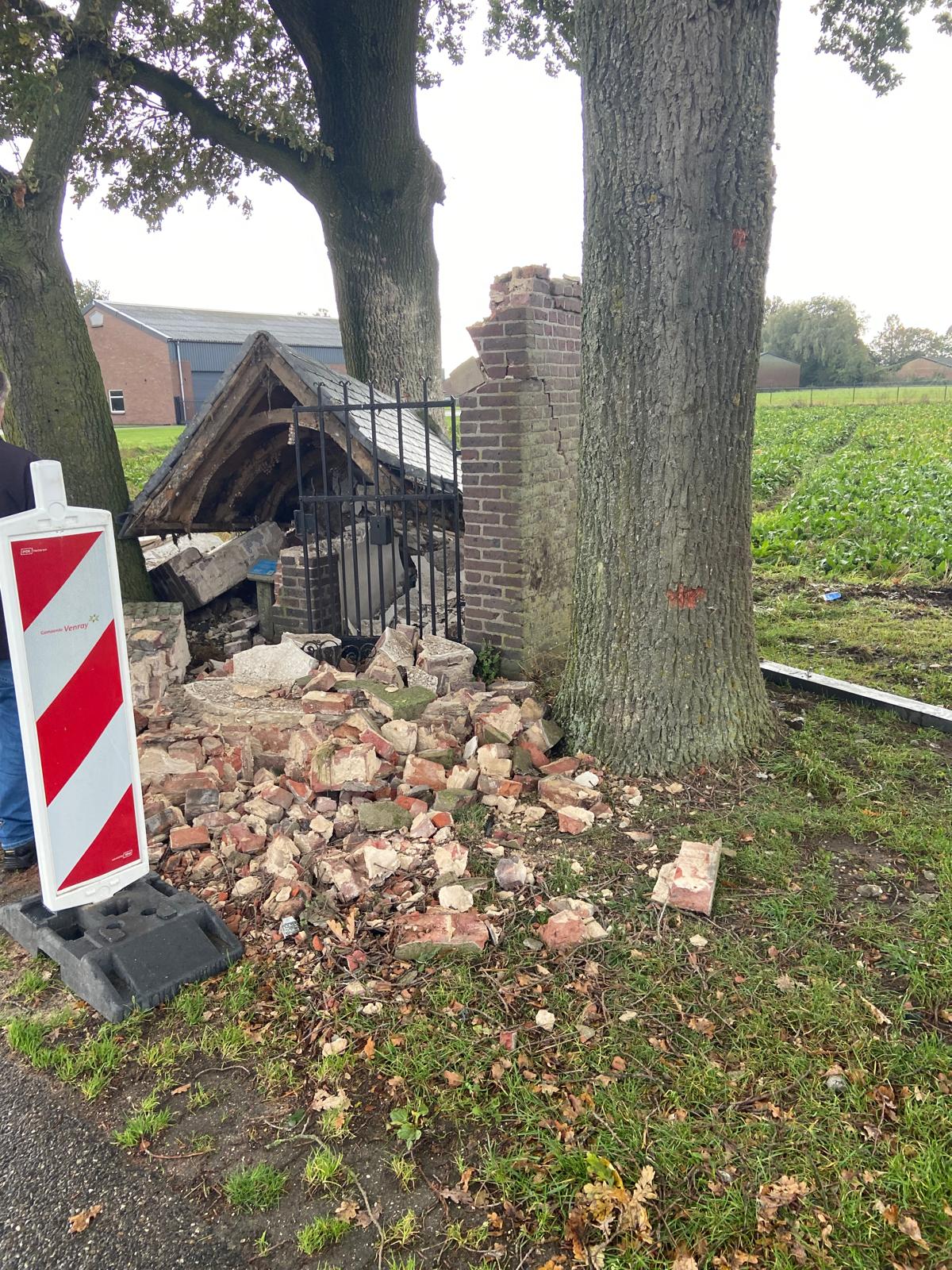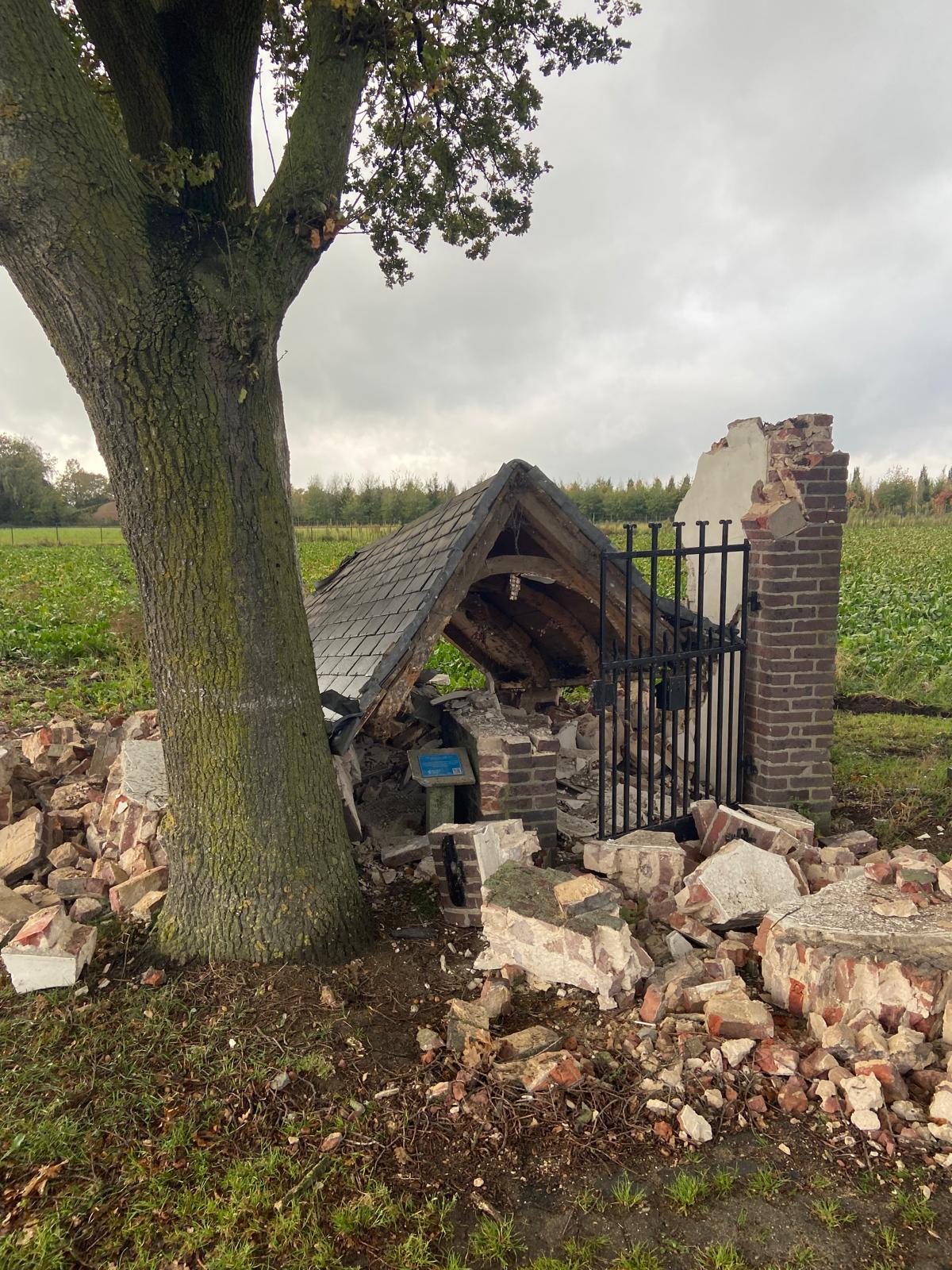 Na inspectie en vastlegging zijn alle onderdelen en stenen die meters verderop verspreid lagen van de kapel afgelopen vrijdag door de vrijwilligers van Kruisen en Kapellen veilig gesteld. Gelukkig zijn hierbij ook de beelden grotendeels terug gevonden alsmede de smeedijzeren onderdelen.