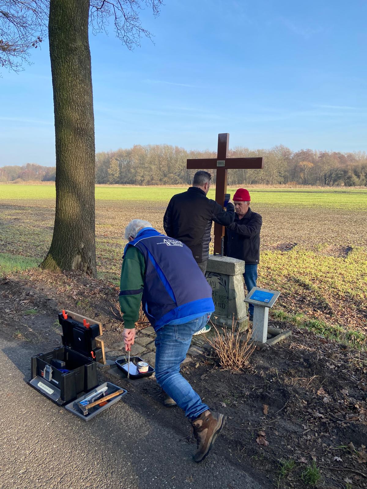 Het kruis is afgelopen week terug geplaatst op de sokkel aan de Weideweg in Leunen.